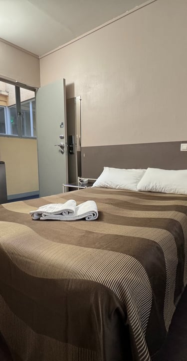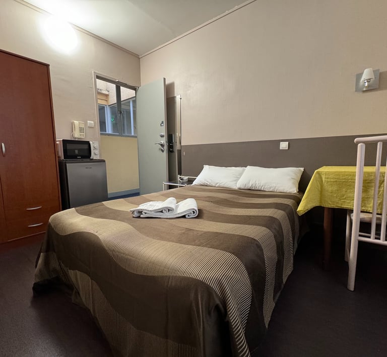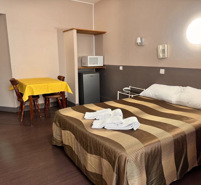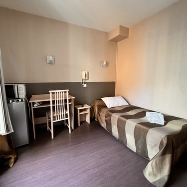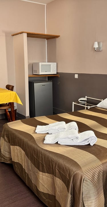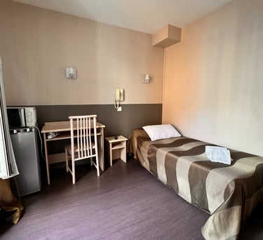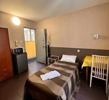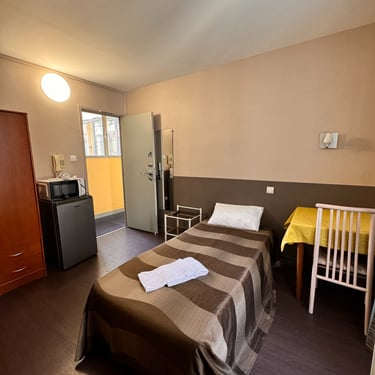 Chambre de 10 à 12m2, pour une personne, avec lit en 90 ou en 140 sur chacun des trois niveaux et donnant sur la rue du Bourg ou la rue Baron Duprat. Salle de douche, frigidaire, micro-ondes, TV et wifi.
