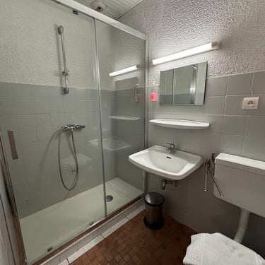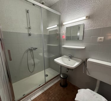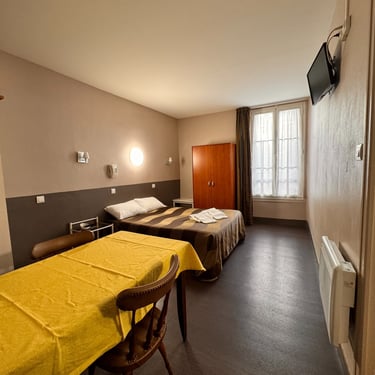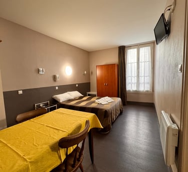 Chambre de 14 à 18m2, pour deux personnes, située au 1er ou au 2èm étage et donnant sur la rue du Bourg. Salle de douche à l'italienne, frigidaire, micro-ondes, TV et wifi.